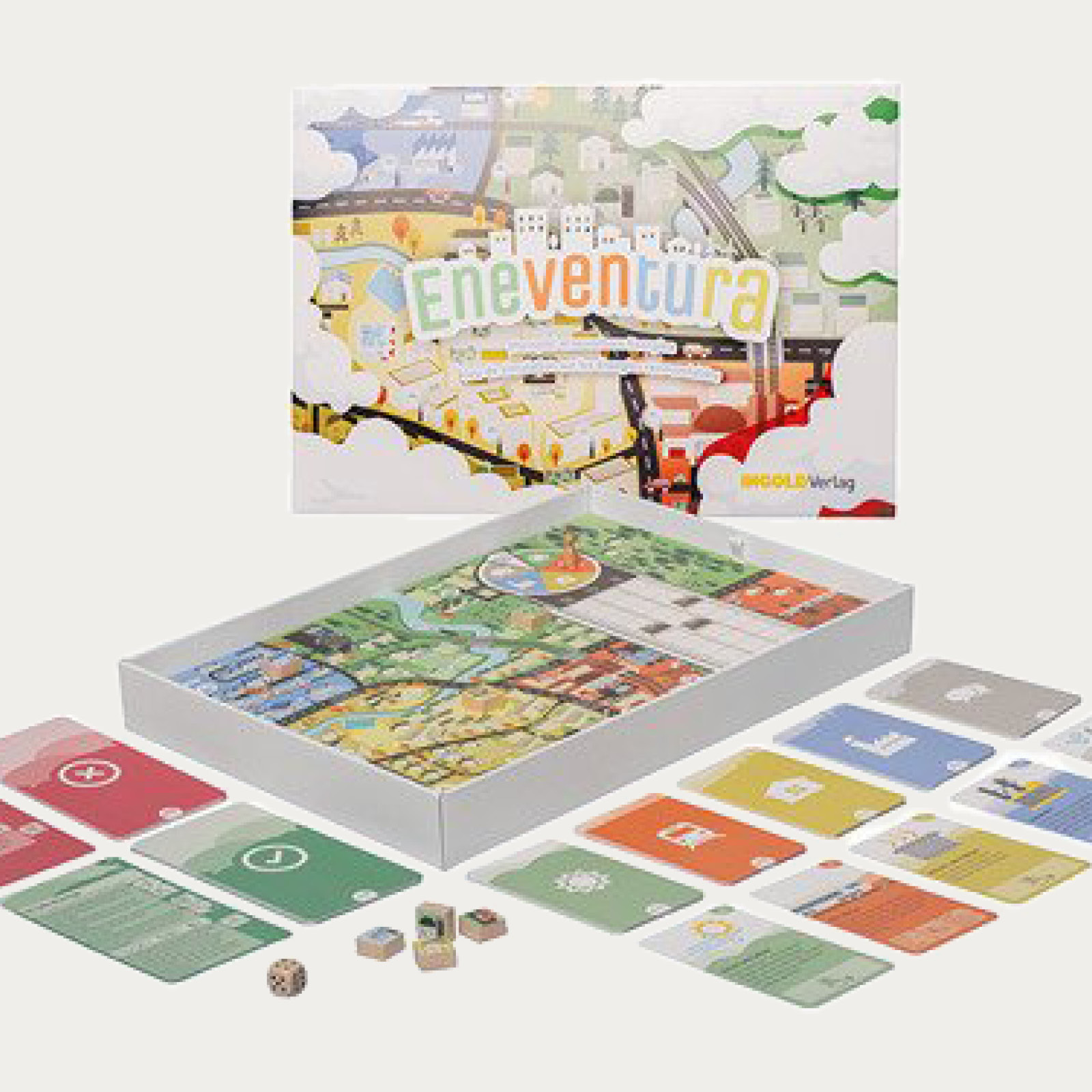 Das Lern- und Strategiespiel Eneventura wurde vom INGOLDVerlag entwickelt und produziert. In ihrem Auftrag durften wir magnetische Holzspielsteine im Fünffarbdruck fertigen. Die zwölf Spielsteine stellen verschiedene Energieumwandler wie Autos, Gebäude und Kraftwerke dar. Jede Platzierung der Steine beeinflusst unmittelbar die Energienutzung und -bereitstellung einer vollständig durch erneuerbare Energien versorgten Stadt.